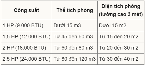 Công suất điều hòa phù hợp sẽ tính theo thể tích phòn,g nên ngoài diện tích, người dùng cần quan tâm đến chiều cao tường. Tại Việt Nam, tường nhà hoặc chung cư dao động trên dưới 3 m2. Mỗi m3 thể tích phòng sẽ cần công suất khoảng 200 BTU. Người dùng có thể tham khảo bảng dưới để chọn công suất cần thiết.