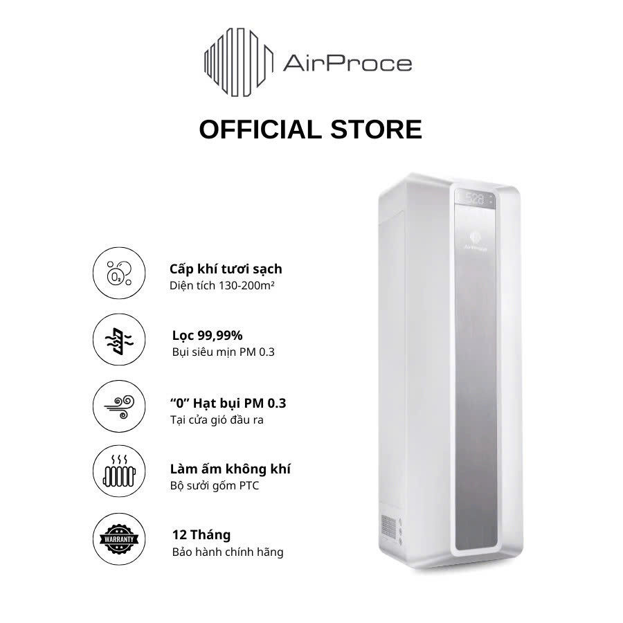 - “Khám phá AirProce SmartVent AC-500 – máy cấp khí tươi và lọc không khí cao cấp nhất hiện nay với 5 lớp màng lọc HEPA H13/14, loại bỏ PM2.5, CO2, formaldehyde hiệu quả. Độ ồn cực thấp, diện tích tối ưu 130-200m2. Bảo vệ sức khỏe gia đình bạn.”