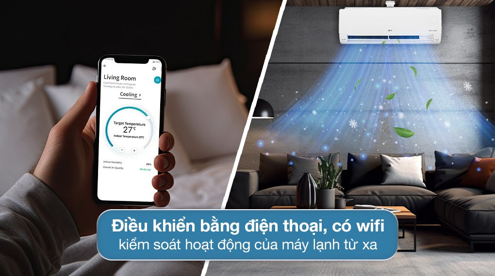 Máy lạnh LG V13APFP có khả năng kết nối wifi để bạn điều khiển máy lạnh ở bất kỳ đâu bằng Smartphone thông qua ứng dụng LG ThinQ. Điều này vô cùng hữu ích khi bạn đã ra ngoài mà quên tắt máy lạnh, hoặc không nhớ mình đã tắt hay chưa, hoặc bạn muốn khởi động máy lạnh trước để tận hưởng sự mát mẻ ngay khi về phòng.