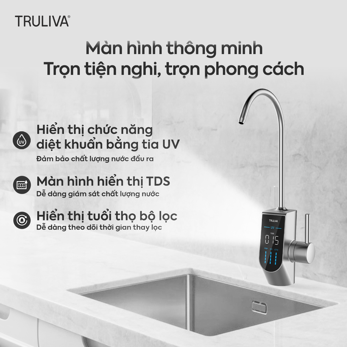 Màn hình thông minh của Truliva UR5840 không chỉ nâng tầm thẩm mỹ cho căn bếp mà còn giúp người dùng dễ dàng theo dõi các thông số quan trọng. Chức năng diệt khuẩn bằng tia UV đảm bảo chất lượng nước đầu ra luôn ở mức an toàn nhất. Bạn sẽ dễ dàng giám sát chất lượng nước nhờ vào chỉ số TDS hiển thị rõ ràng, cùng với đó là thông tin về tuổi thọ bộ lọc để biết khi nào cần thay lõi.