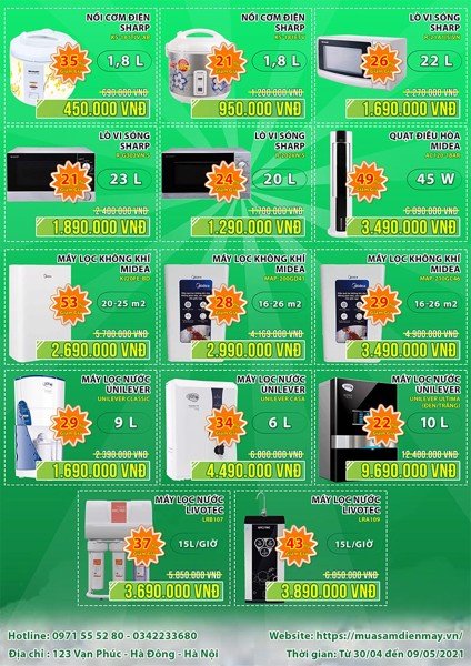 Khuấy đảo hè 2021, hàng loạt sản phẩm gia dụng có mức giá bán khai trương cực kỳ hấp dẫn: Nồi cơm điện Sharp giảm 35% giá thanh toán chỉ 450.000đ, Lò vi sóng Sharp giá khai trương 1.290.000đ,.. Đặc biệt các sản phẩm Máy lọc không khí Midea giảm sâu tới 53%, Quạt điều hòa Midea giảm 49%. Và rất nhiều ưu đãi dành cho Máy lọc nước Unilever, Livotec giảm lên tới 43%.